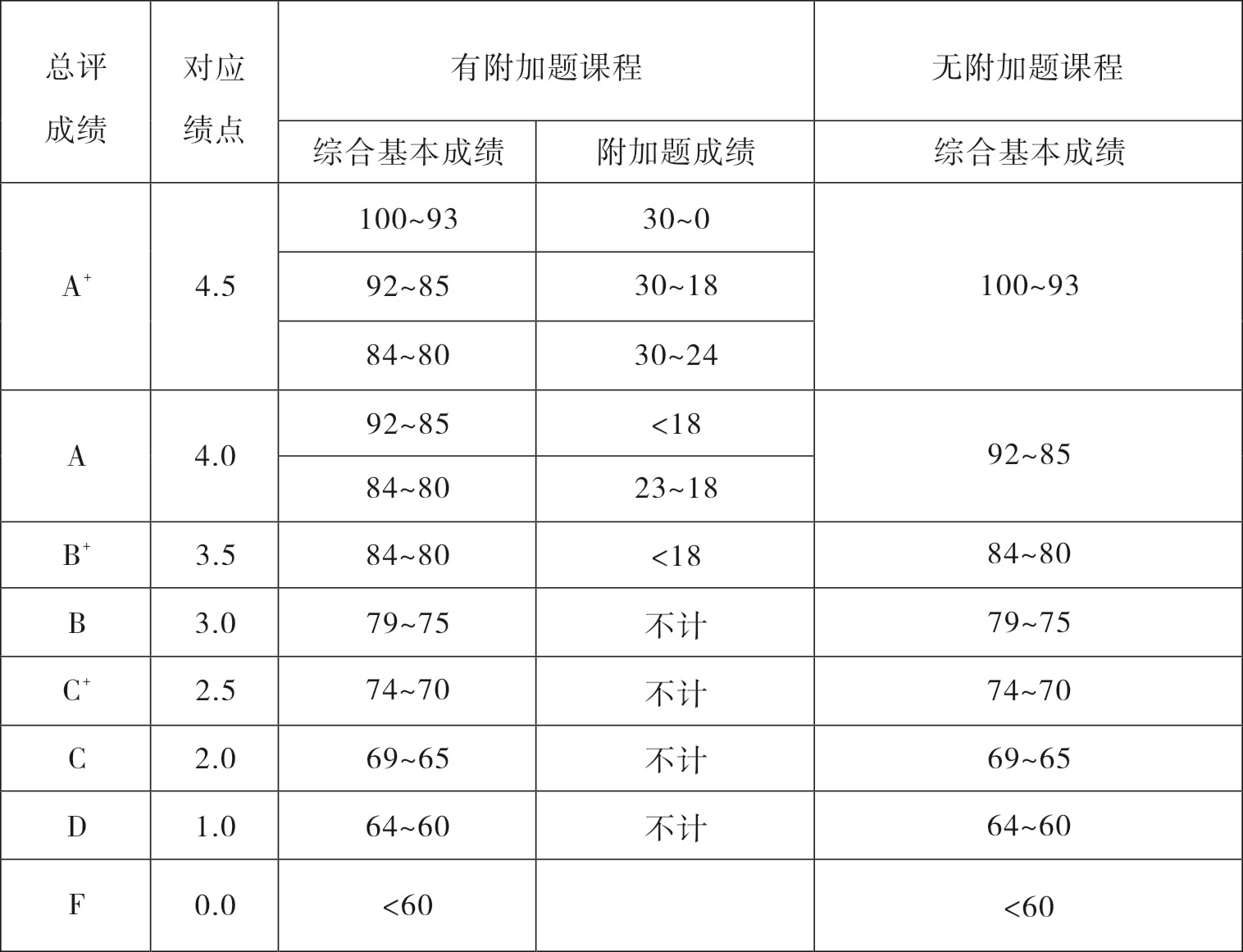 第三十七条 课程综合基本成绩、附加题成绩、总评成绩与绩点对照如下表: