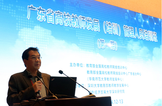 为进一步加强高校教师培训工作,促进高校教师专业发展和素质提升,推动高校教师队伍建设迈上新台阶,4月12-13日,由教育部全国高校教师网络培训中心(以下简称全国网培中心)、全国网培中心广东省分中心(华南师范大学教师发展中心)主办,深圳大学教务部教师教学发展中心、对外经济贸易大学深圳研究院承办的“广东省2018年高校教师发展(培训)管理人员培训班”在深圳大学成功举办。全国网培中心副主任陈振、深圳大学教务部教师教学发展中心主任孙忠梅分别在开班仪式上发言。来自广东省43所本科院校,19所高职高专院校120余名教发、人事、教务负责人及一线工作者参加了此次培训。华南师范大学教师发展中心主任陈启买主持开班仪式。