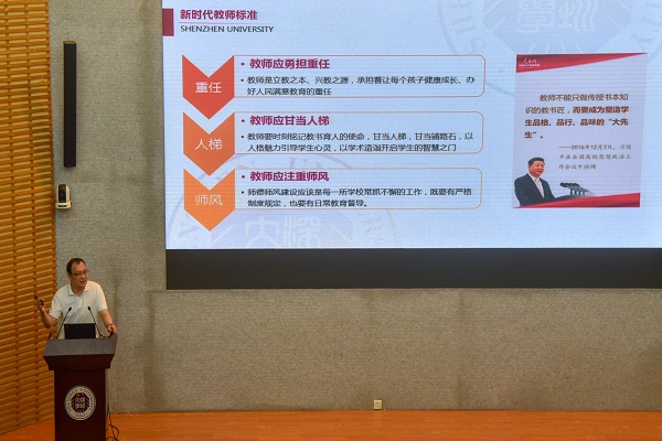 接下来,袁主任以“深圳大学本科教育教学管理体系与制度分享”为主题,将“约束、支持、激励”三个关键词作为此次演讲的核心,全面而又详细地为青年教师介绍了学校的规章制度、教师发展以及激励体系等内容。第一个关键词:约束。袁主任从教师纪律与规范,课堂、实验、考试、教材管理细则,教学事故规定三方面分别进行介绍。袁主任强调课堂是教师的主战场,教师要注重课堂教学。现在的高等教育逐渐由原来的以教为中心,转变为以学为中心;以教师为中心,转变为以学生为中心,青年教师需要注重课堂教学的转变。第二个关键词:支持。按教师发展从新入职教师、青年教师、骨干教师和资深教师分为工作主体,学校分层分类分步骤实施教师教育教学能力提升。学校对于青年教师的培养有:“薪火计划”、海外研修计划和教学研究改革项目。“薪火计划”由导师团对青年教师进行指导和培养;海外研修计划支持更多优秀青年教师出国研修;教学研究改革项目加强教学改革研究,提升教师教学水平,对青年教师有特定名额支持。第三个关键词:激励。深圳大学本科教学奖励分为:综合奖、突出贡献奖、教学竞赛奖、教学单项奖四大类,为教师的发展提供多层次激励。袁主任给在座的青年教师展示了深圳大学教学名师和和历届校长教学奖获得者名单,以此鼓励大家认真做好教学工作。随后袁主任对青年教师提出殷切希望:高水平大学建设离不开青年教师,学校的进步带动着青年教师不断的成长,二者相辅相成。