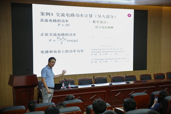 紧接着,费老师通过八个案例详细阐述“面向‘以学为主’的教学设计”在明确学习目标、课堂教学流程设计、课堂互动设计、PPT和板书设计以及课后活动设计方面的具体内容。他认为“以学为主的教学设计”在明确教学目标的前提下,要有针对性的设计课堂教学流程,充分借助信息技术提高课堂互动效率,善于利用PPT动态呈现教师的讲解和学生的思考过程,面向“以学为主”的教学设计要贯穿课内课外,课后活动设计可以提供书面作业、学习通作业、观看教师指定的MOOC内容以及完成小组活动等。费老师还通过课堂案例分析,从中归纳出三个教学流程:一、导入,即讲什么、为什么、解决什么问题;二、分解,将教学内容分解为一系列问题呈现给学生;三、拓展,即课外阅读、研究前沿以及实际应用。其中导入主要是为了激发学生学习兴趣、吸引学生注意力以及暴露学生的认知冲突;分解教学内容的目的在于鼓励学生思考、尝试解答、体验并归纳知识;拓展是为了让学生的专业技能得到进一步的提升。