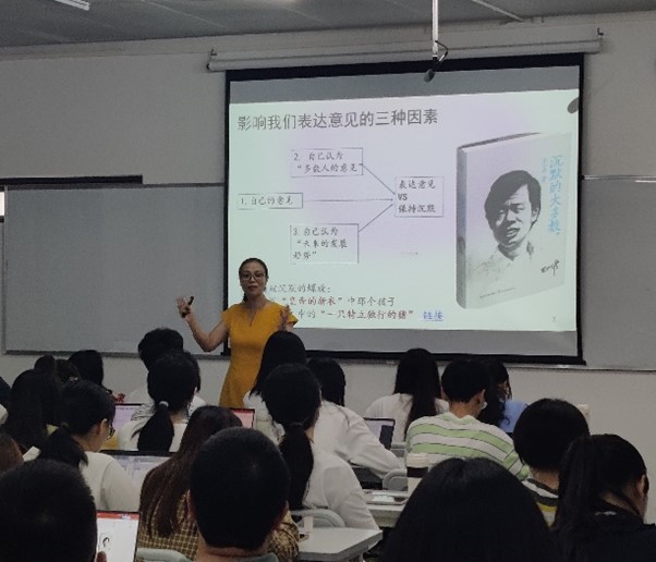 6月6日下午,第一节观摩课是由传播学院周裕琼老师带来的《传播学理论》。在课堂开始,周老师通过“沉默的螺旋”和“第三人效果”的对比,以问题为导向激发学生兴趣、引导学生思考。然后通过视频《觉醒年代》中的精彩片段导入沉默的螺旋相关理论内容,既切合课堂教学主题,又具有极大的警醒意义。周老师的PPT内容生动有趣,极具吸引力,准确抓住了学生的关注点和兴趣点,课堂氛围热烈,掌声不断。在座的青年教师纷纷表示周老师的课程让他们在教育教学方法、变革创新等方面受益良多。