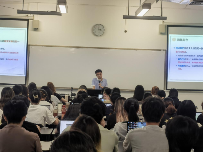 5月20日下午,心理学院蒋多老师为青年教师带来一堂生动形象的《管理心理学》公开课。蒋老师在回顾上节课有关角色分类知识点的基础上引入本节课内容,该课堂设计提升了课程内容的连贯性,有助于培养学生对课本内容的一体化认知。在面对“群体角色”、“群体规范”、“群体思维”等抽象名词时,蒋老师从自身老师这一角色出发,引导学生了解上述抽象名词,课堂内容借助“生活工作中有哪些心理契约?”、“我们承担的角色是否会有冲突?”等问题推动,面对学生发散的多元思维,蒋老师以幽默风趣的话语给予回复,并适时提出ERG理论,帮助学生积累相关理论知识,提升课程高阶性。青年教师对课堂内容展现高度兴趣,表示受益匪浅。