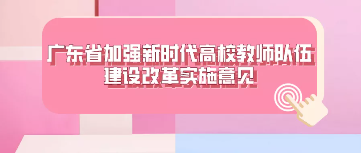 近日,广东省教育厅、中共广东省委组织部、中共广东省委宣传部、中共广东省委机构编制委员会办公室、广东省财政厅、广东省人力资源和社会保障厅、广东省住房和城乡建设厅印发《广东省加强新时代高校教师队伍建设改革实施意见》,对进一步加强高校教师队伍建设,打造高素质创新型教师队伍提出了20点要求。